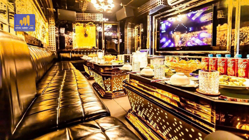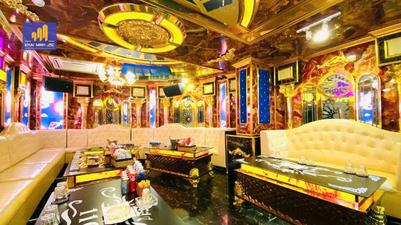 Nội thất nổi bật với ghế sofa dài bọc da cao cấp, được thiết kế với các đường may tinh tế, mang lại vẻ hiện đại và đẳng cấp. Bàn karaoke được thiết kế độc đáo với chất liệu kính và khung kim loại, tô điểm thêm các hoa văn ánh sáng vàng, tạo nên không khí ấm cúng và lộng lẫy. Tường và trần nhà được trang trí với các tấm gương phản chiếu ánh sáng, tạo hiệu ứng thị giác bắt mắt và giúp không gian trở nên rộng rãi hơn.